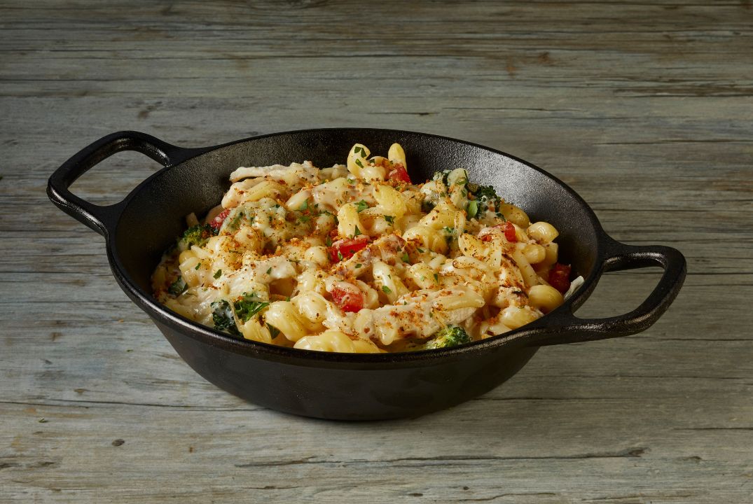 Grilled Chicken Breast, tomatoes, broccoli, creamy scampi sauce, 2 cheeses, breadcrumbs, corkscrew pasta.